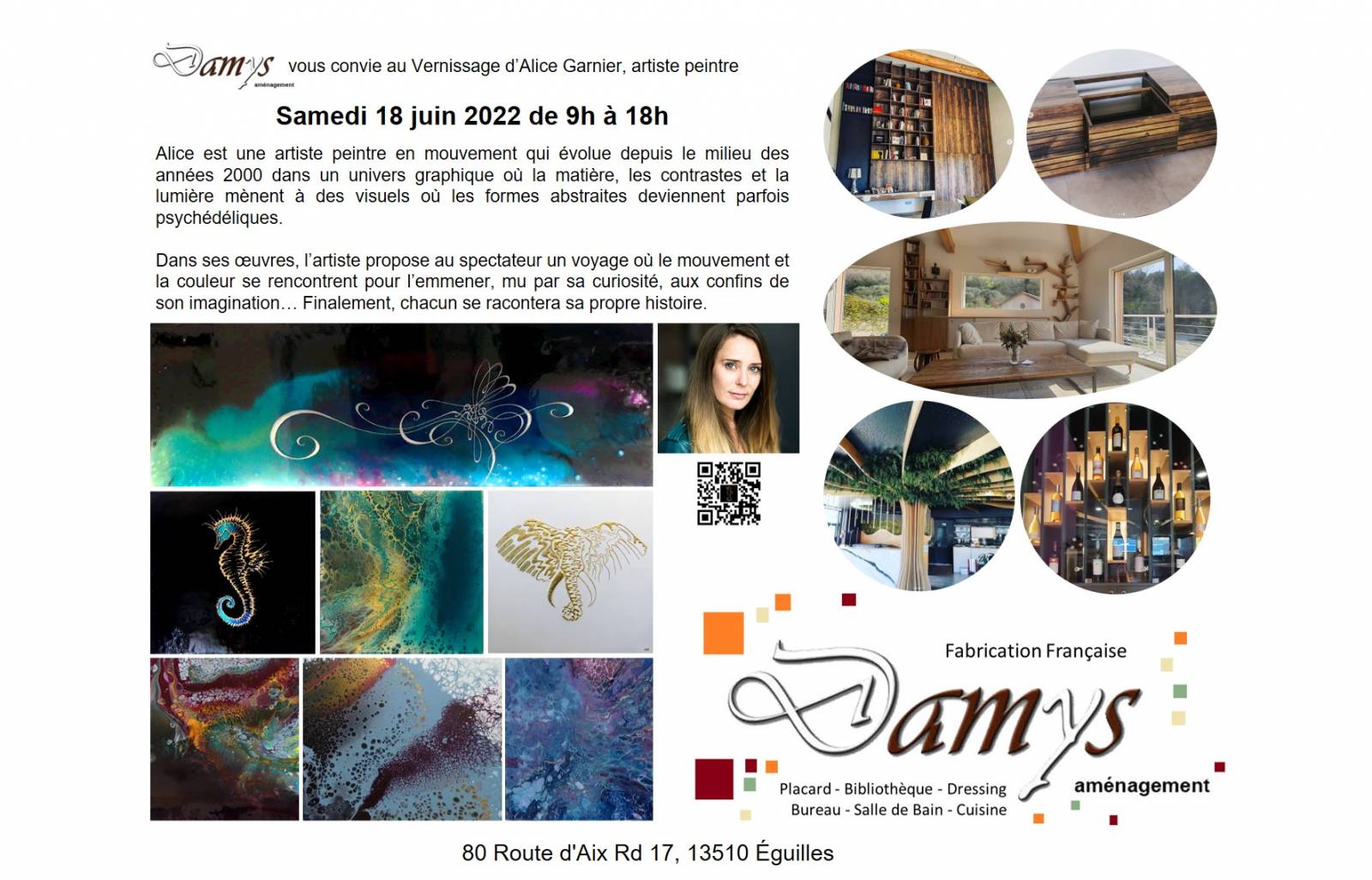 Damys Aménagement vous convie à venir admirer certaines des œuvres les plus spectaculaires de l'artiste lors de cette journée vernissage qui célèbrera l'été autour d'une collation. Venez nombreux !